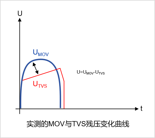 以浪涌1.2/50us-8/20μs 2Ω,6KV 3KA浪涌測試標準為例。假設(shè)MOV殘壓在150V,TVS殘壓期望控制在90V(圖2),TVS的IPP 只有700A。假設(shè),鉗位電壓的脈沖寬度40μs(實測),電感的電流變化40μs內(nèi)應(yīng)該小于700A,