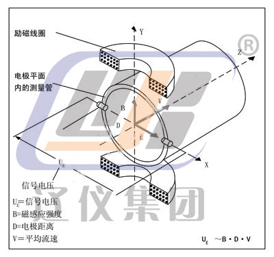 電磁流量計所依據(jù)的基本原理是法拉第電磁感應(yīng)定律,導(dǎo)體在磁場中做切割磁力線運(yùn)動時,導(dǎo)體內(nèi)將產(chǎn)生感應(yīng)電動勢。將該原理應(yīng)用于測量管內(nèi)流動的導(dǎo)電液體,并且流體流動的方向與磁場方向垂直(見圖)。流體中產(chǎn)生的感應(yīng)電動勢被位于管子徑向兩端的一對電極檢測到,該感應(yīng)電動勢被位于管子徑向兩端的一對電極檢測到,該感應(yīng)電動勢(信號電壓)UE與磁感應(yīng)強(qiáng)度B,電極間距離D和平均流速V成正比。因磁感強(qiáng)度B和電極距離D和平均流速V成正比。因磁感應(yīng)強(qiáng)度B和電極距離D是常數(shù),所以感應(yīng)電動勢(信號電壓)UE與平均流速V成正比,而體積流量又與平均流速V成正比,所以體積流量與感應(yīng)信號電壓成正比。在信號轉(zhuǎn)換器中,該感應(yīng)信號電壓被轉(zhuǎn)換成體積流量,同時轉(zhuǎn)換成可編程的模擬和數(shù)字信號輸出。